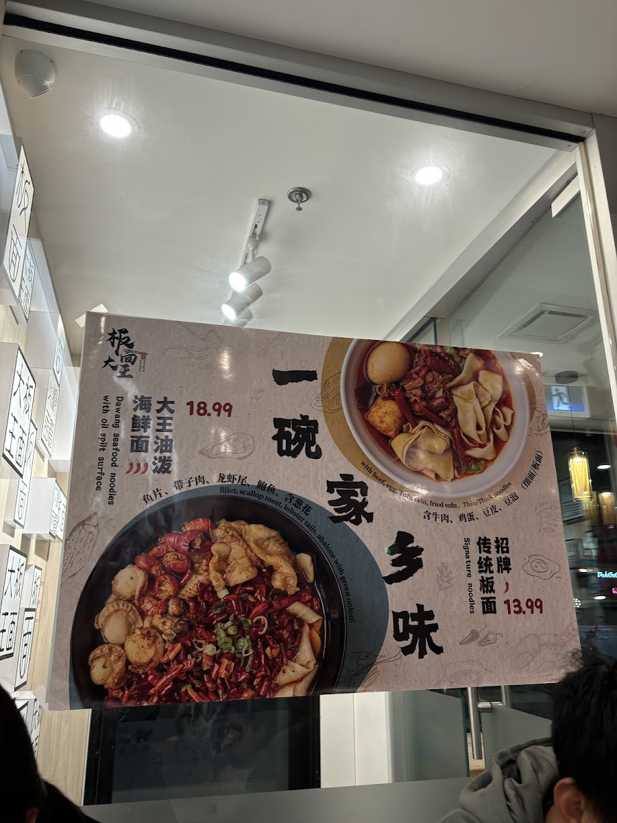 DaWang Seafood Noodles with Spicy OIl, Fish Fillet, Scallop,Crawfish, Abalone with Green Onion (recommend less spicy) chili powder contain peanut,if you allergy please order something else (含鱼片,带子肉,龙虾尾,鲍鱼,含葱花) (友情提示:比较辣,建议少辣) (辣椒含花生成份,过敏请勿点)